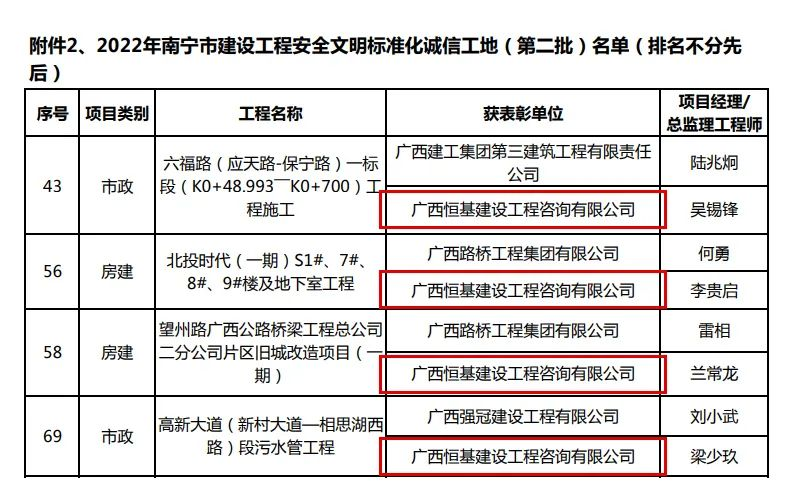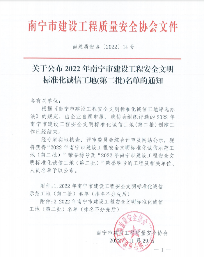 ▲2022年南寧市建設(shè)工程安全文明標(biāo)準(zhǔn)化誠(chéng)信工地(第二批)獲獎(jiǎng)名單