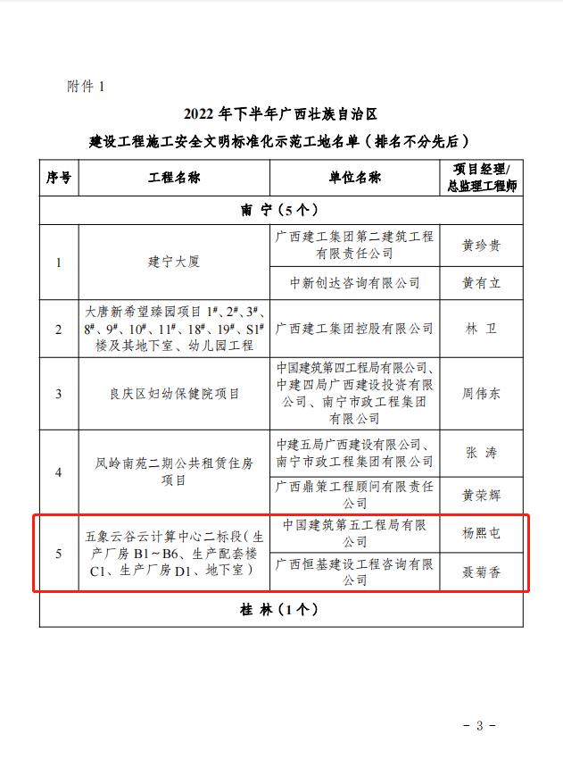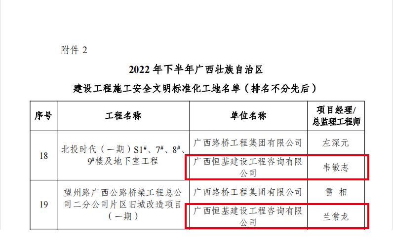 1月17日,廣西工程建設質(zhì)量安全管理協(xié)會公布了2022年下半年廣西建設工程施工安全文明標準化示范工地及2022年下半年廣西建設工程施工安全文明標準化工地名單,恒基咨詢1個項目榮獲2022年下半年廣西建設工程施工安全文明標準化示范工地,2個項目榮獲2022年下半年廣西建設工程施工安全文明標準化工地。