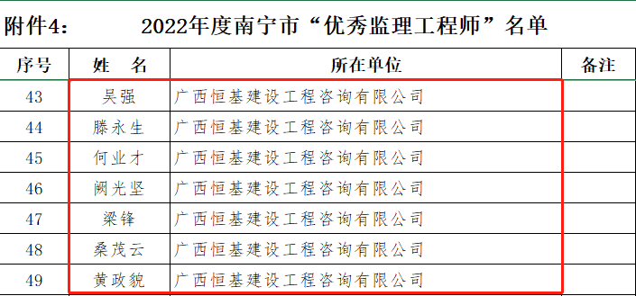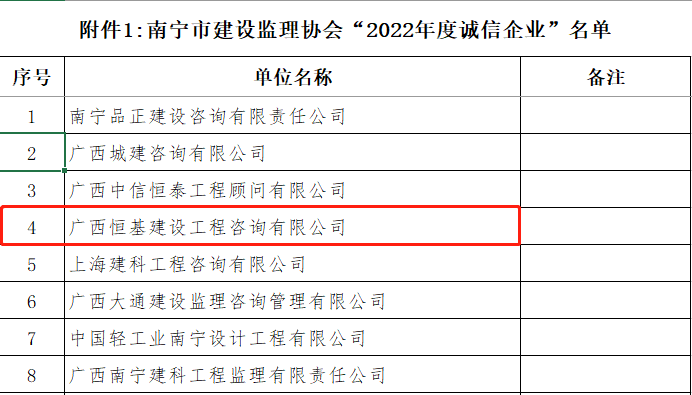 衡量一家企業(yè)綜合實力的重要指標(biāo),它是基于評估對象的信用紀(jì)錄、履約能力、經(jīng)營狀況、綜合實力與競爭力等多項指標(biāo)的科學(xué)評估與認(rèn)證。獲評“2022年度誠信企業(yè)”及2022年度南寧市“先進(jìn)監(jiān)理單位”這一殊榮,是誠信經(jīng)營累計的集中體現(xiàn),標(biāo)志著恒基咨詢在行業(yè)內(nèi)的企業(yè)信用、項目管理能力、社會責(zé)任等方面均得到監(jiān)理行業(yè)的充分認(rèn)可。2022年度"先進(jìn)監(jiān)理單位"此外,本次公布的年度評選優(yōu)秀個人名單中我司共14人獲評“優(yōu)秀總監(jiān)理工程師”和“優(yōu)秀監(jiān)理工程師”。榮譽(yù)既是對我司項目管理服務(wù)和監(jiān)理人員工作成績的肯定,也是對企業(yè)推動行業(yè)示范效應(yīng)和杰出人才培養(yǎng)的激勵。2022年度"優(yōu)秀總監(jiān)理工程師"2022年度"優(yōu)秀監(jiān)理工程師"本次評定體現(xiàn)了公司在監(jiān)理行業(yè)中堅持誠信守法經(jīng)營、切實履行社會責(zé)任的肯定,對提高公司知名度、拓寬經(jīng)營領(lǐng)域、提升競爭優(yōu)勢等起到積極推動作用,也將進(jìn)一步激勵公司為行業(yè)高質(zhì)量發(fā)展作出新的貢獻(xiàn)。