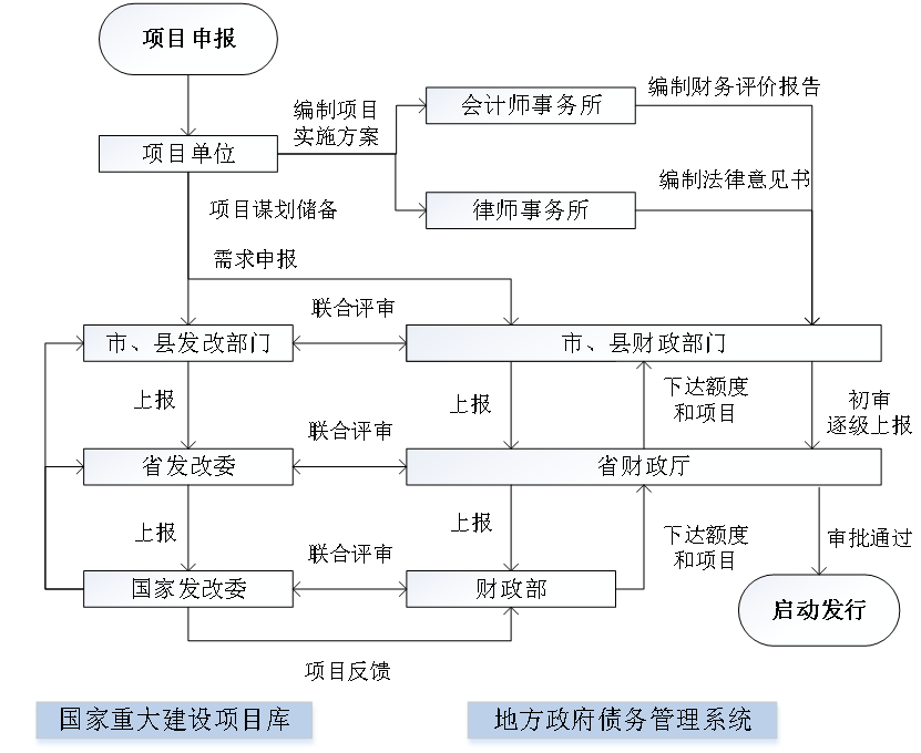 需求申報入庫 | 4 | 根據(jù)上級部門的發(fā)行申報要求,行業(yè)主管部門和項目單位將發(fā)債資料提交至同級發(fā)改和財政部門。 | |