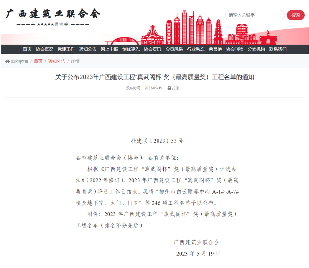 “真武閣杯”獎(jiǎng)是廣西建設(shè)行業(yè)工程質(zhì)量的最高榮譽(yù)獎(jiǎng)項(xiàng),該獎(jiǎng)項(xiàng)的評(píng)選工作是在廣西住房和城鄉(xiāng)建設(shè)廳指導(dǎo)下由廣西建筑業(yè)聯(lián)合會(huì)組織實(shí)施,旨在營造推崇工匠精神的良好社會(huì)氛圍,推動(dòng)廣西建設(shè)工程質(zhì)量水平的提高。根據(jù)評(píng)選章程,在獲得廣西建設(shè)工程“真武閣杯”獎(jiǎng)(最高質(zhì)量獎(jiǎng))項(xiàng)目后,廣西建筑業(yè)聯(lián)合會(huì)將擇優(yōu)推薦作為國家優(yōu)質(zhì)工程獎(jiǎng)、中國建設(shè)工程魯班獎(jiǎng)等獎(jiǎng)項(xiàng)的候選工程項(xiàng)目。
