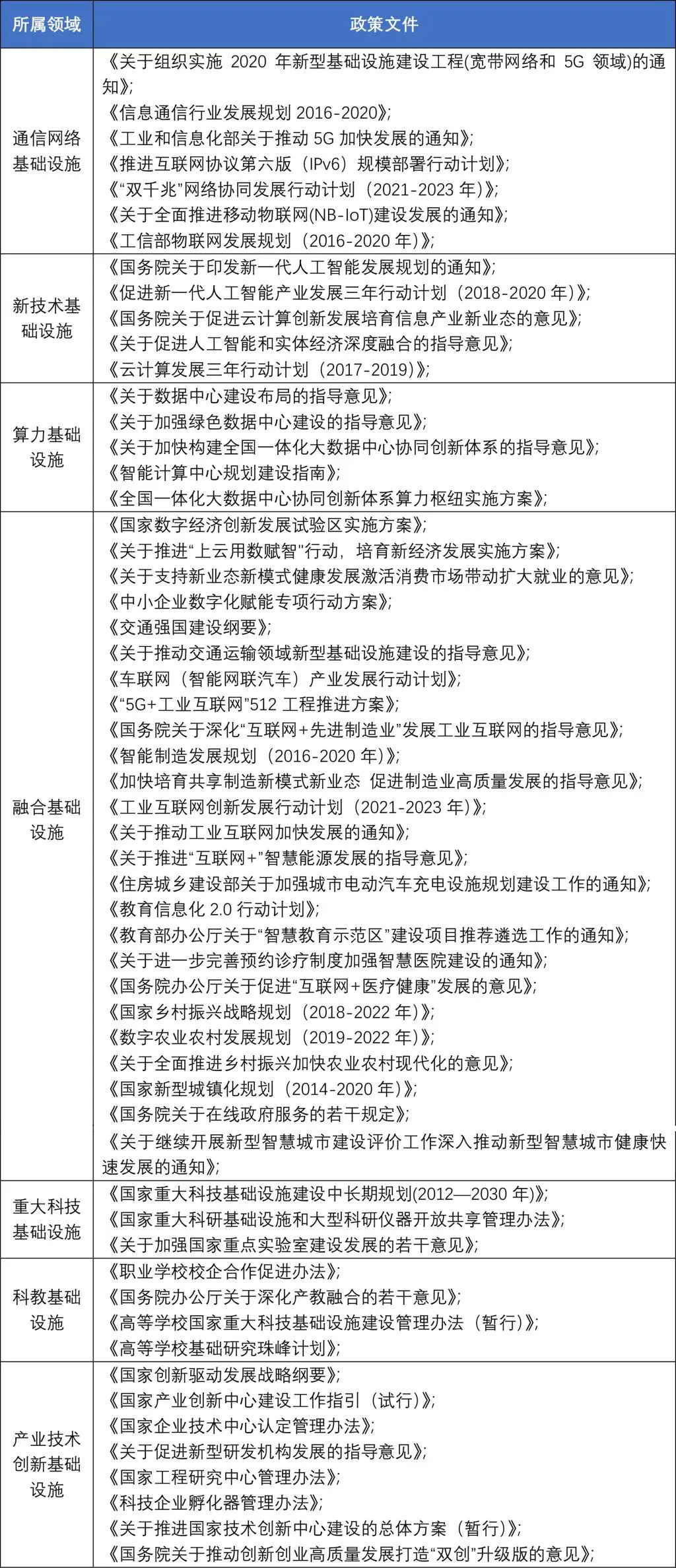 表2:新型基礎設施各領域涉及到的部分政策整理