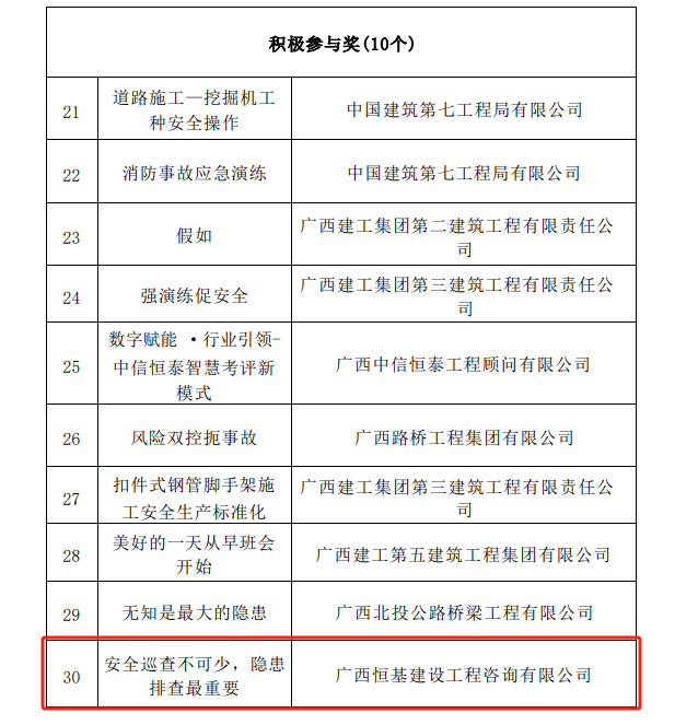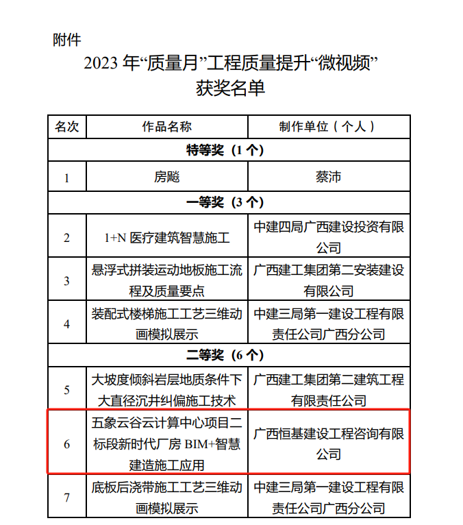近日,廣西建設(shè)工程質(zhì)量安全管理站公布2023年“質(zhì)量月”工程質(zhì)量提升“微視頻” 獲獎名單,恒基咨詢選送作品《五象云谷云計算中心項目二標段新時代廠房BIM+智慧建造施工應(yīng)用》榮獲二等獎。2023年“安全生產(chǎn)月”安全管理提升“微視頻”征集活動選送作品《安全巡查不可少,隱患排查最重要》獲積極參與獎。