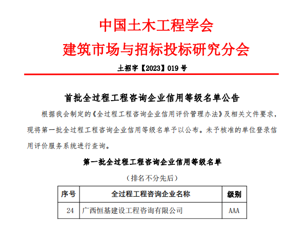 近日,中國(guó)土木工程學(xué)會(huì)建筑市場(chǎng)與招標(biāo)投標(biāo)研究分會(huì)公布了第一批全過程工程咨詢企業(yè)信用等級(jí)名單,恒基咨詢位列其中,獲評(píng)最高等級(jí)AAA級(jí)信用評(píng)級(jí)。
