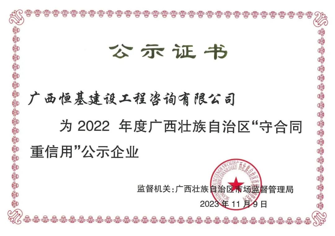 近日,廣西壯族自治區(qū)市場監(jiān)督管理局公布了《關(guān)于公示2022年度廣西“守合同重信用”企業(yè)名單的通告》。恒基咨詢榜上有名,憑借良好信譽(yù)再獲廣西“守合同重信用”企業(yè)榮譽(yù)稱號。