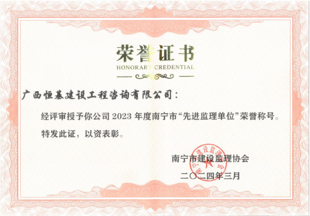 近日,南寧市建設監(jiān)理協(xié)會對2023年度誠信企業(yè)、南寧市先進監(jiān)理單位和優(yōu)秀個人進行表彰,恒基咨詢榮獲“2023年度誠信企業(yè)”、南寧市“先進監(jiān)理單位”稱號,公司共13人榮獲“優(yōu)秀總監(jiān)理工程師”“優(yōu)秀監(jiān)理工程師”稱號。