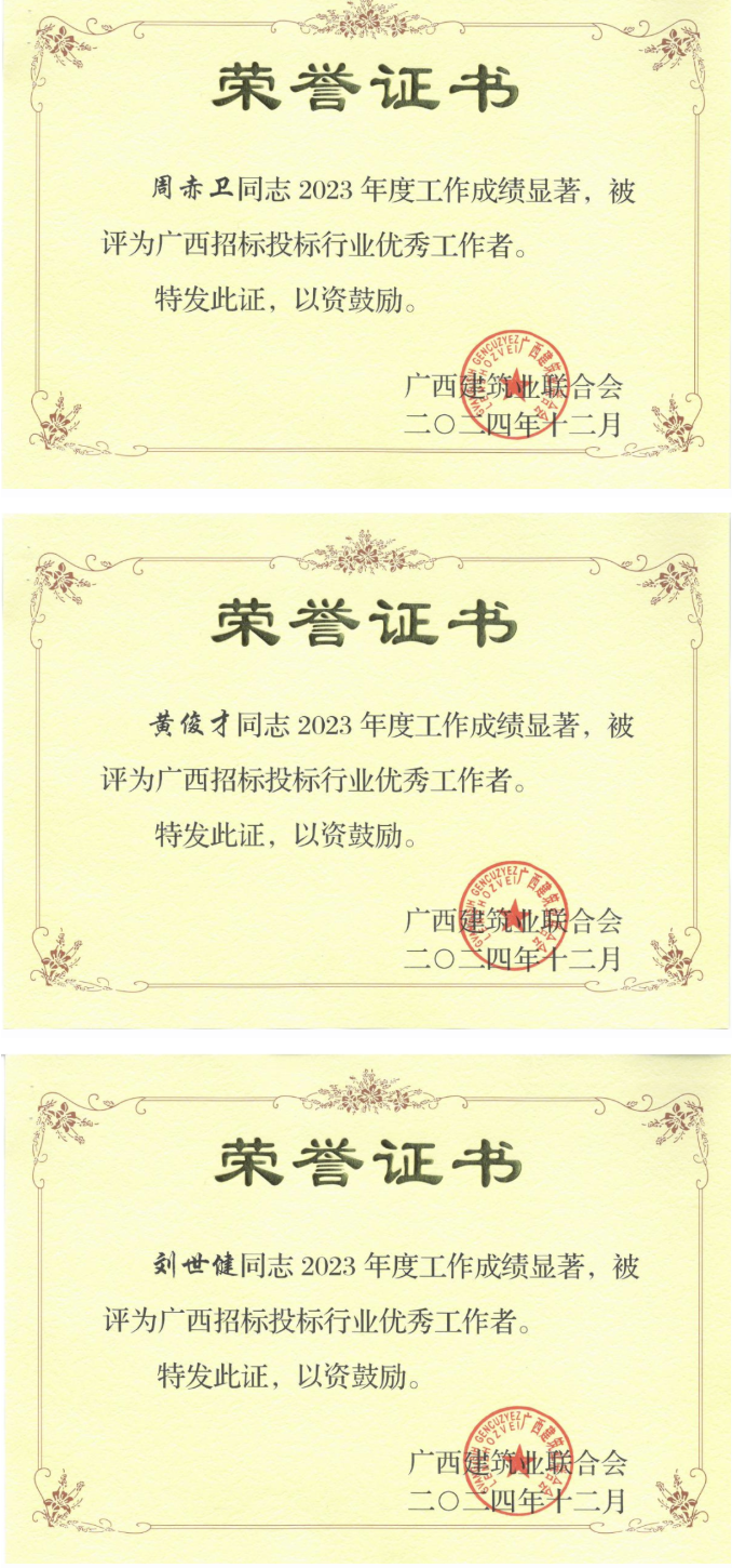近日,廣西建筑業(yè)聯合會發(fā)布了《關于2023年度招標投標行業(yè)優(yōu)秀企業(yè)和優(yōu)秀工作者名單的通知》,恒基咨詢憑借在招標投標領域的優(yōu)秀表現,榮獲2023年度“廣西招標投標行業(yè)優(yōu)秀企業(yè)”稱號。同時,公司4名員工獲評“廣西招標投標行業(yè)優(yōu)秀工作者”。
