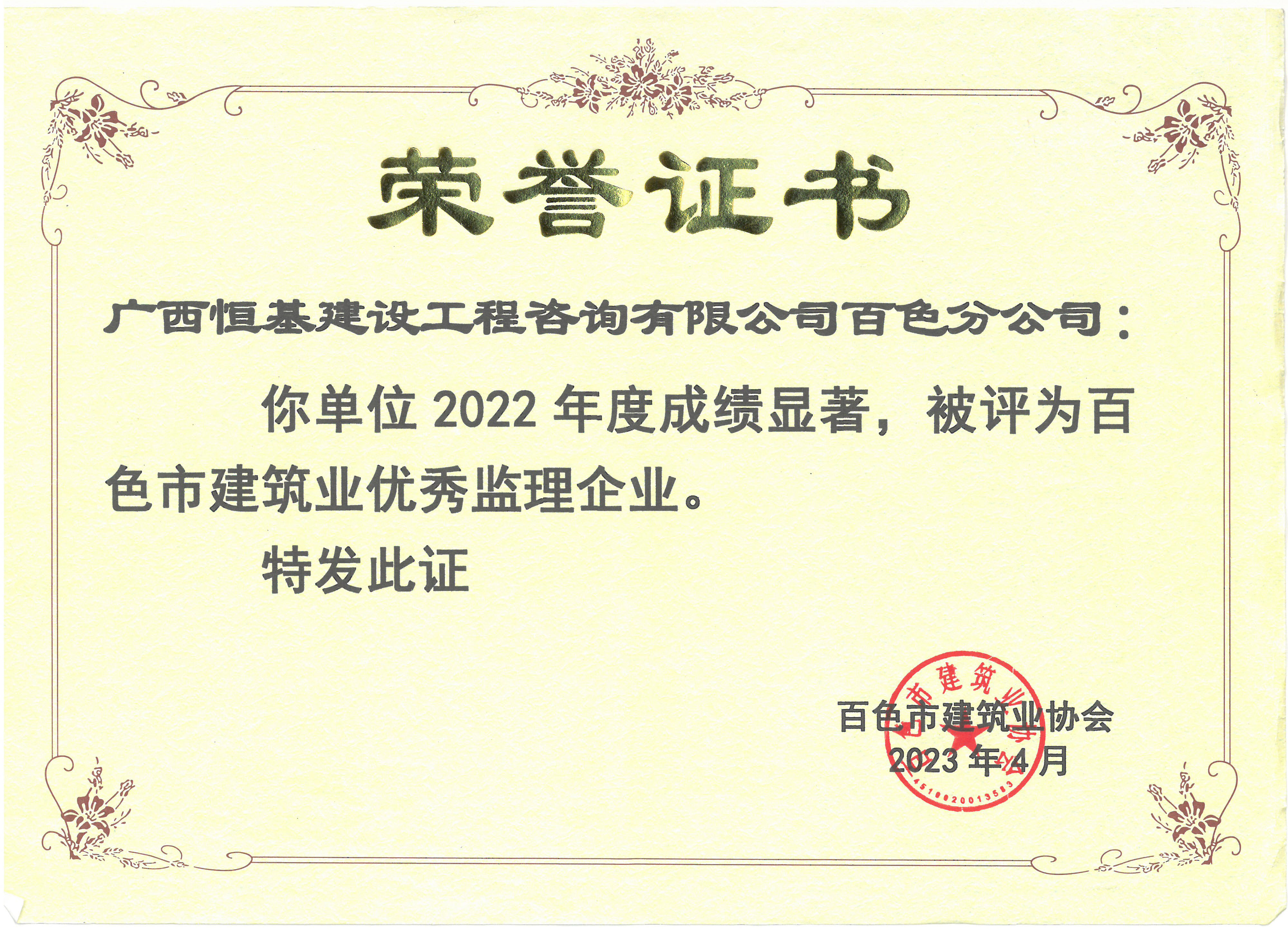 2022年度百色市建筑業(yè)優(yōu)秀監(jiān)理企業(yè)