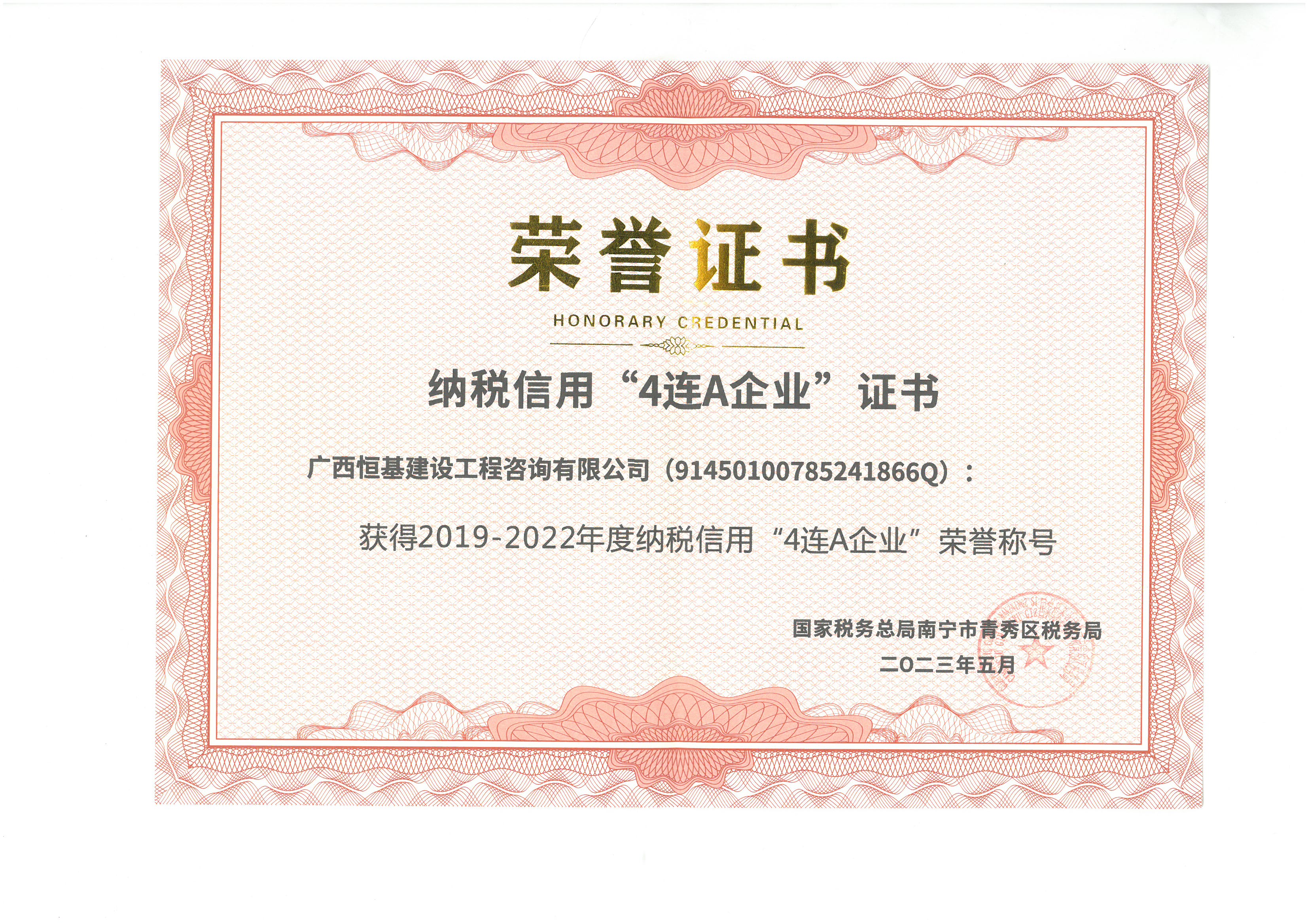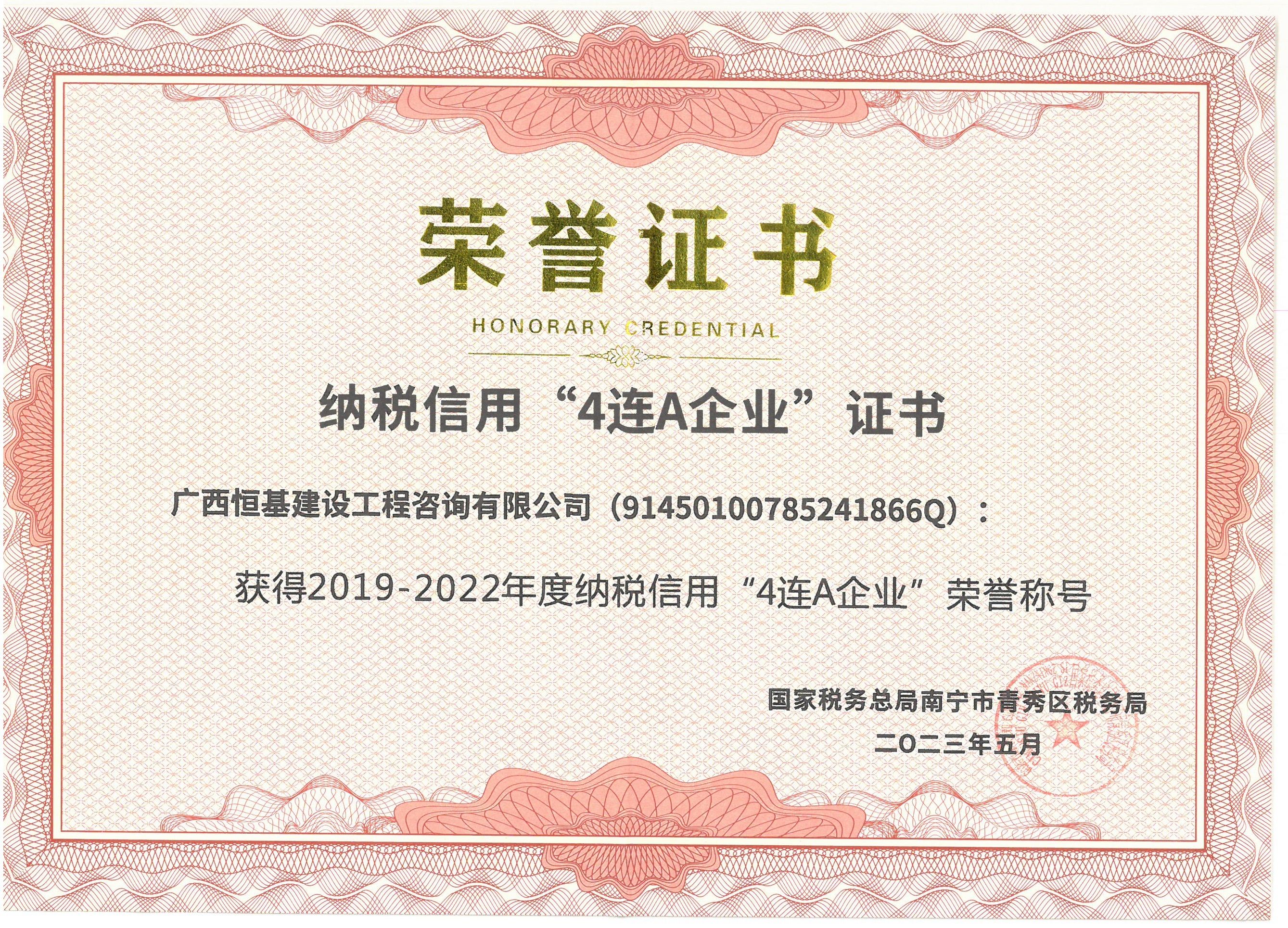 "2019-2022年度納稅信用“4連A企業(yè)”榮譽(yù)稱號 "