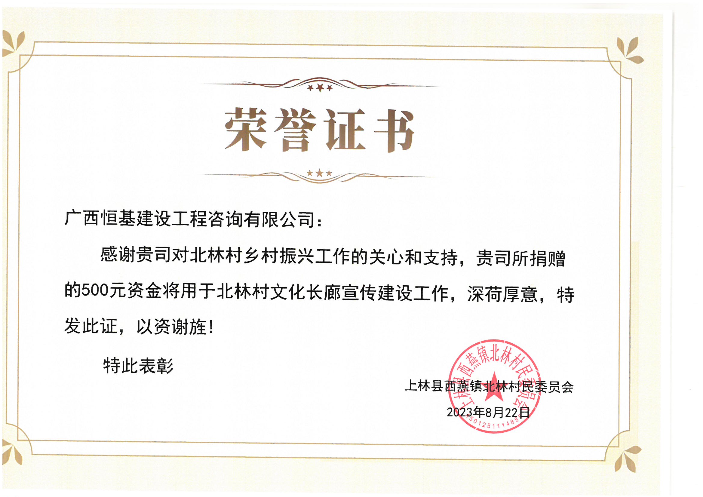 助力鄉(xiāng)村振興“北林村”捐贈-榮譽(yù)證書